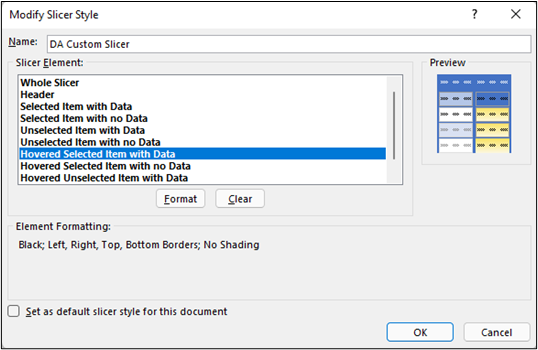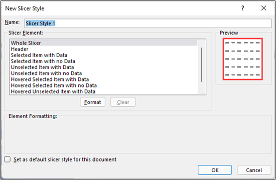 - To set this style as the default for all new slicers, put a tick in the Set as default slicer style for this document checkbox.