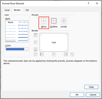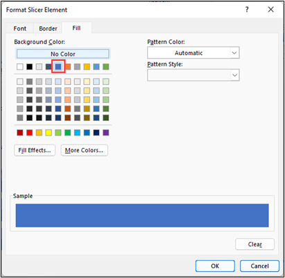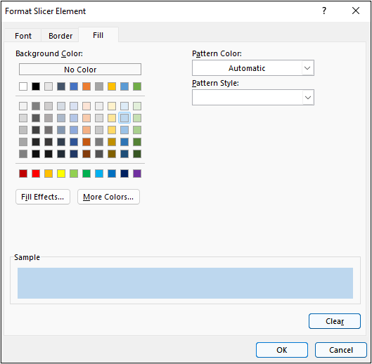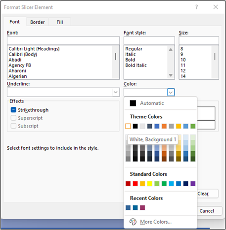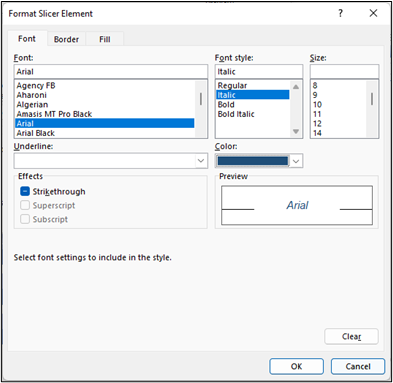 - Use the Font, Border, and Fill tabs to customize the overall look and feel of the slicer.
